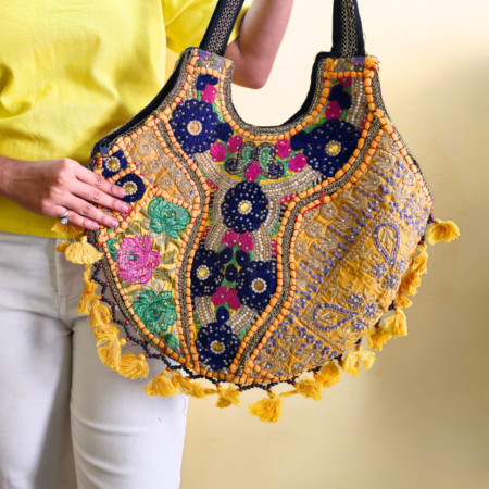 ₹1,799.00Original price was: ₹1,799.00.₹799.00Current price is: ₹799.00.- The bag features an embroidered surface with floral motifs, bead accents, and contrasting stitched details across the panels.