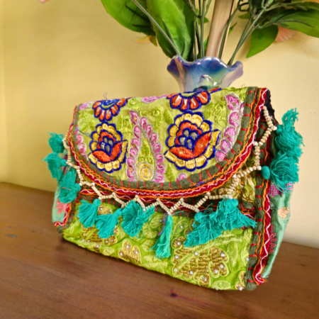 ₹1,299.00Original price was: ₹1,299.00.₹599.00Current price is: ₹599.00.- Features a bright design with patterned fabric and decorative tassels.