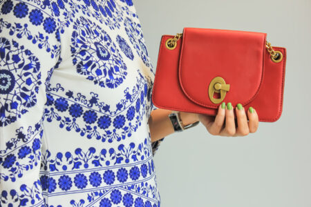 - Compact size suitable for carrying small essentials like a phone, cards, and cosmetics.