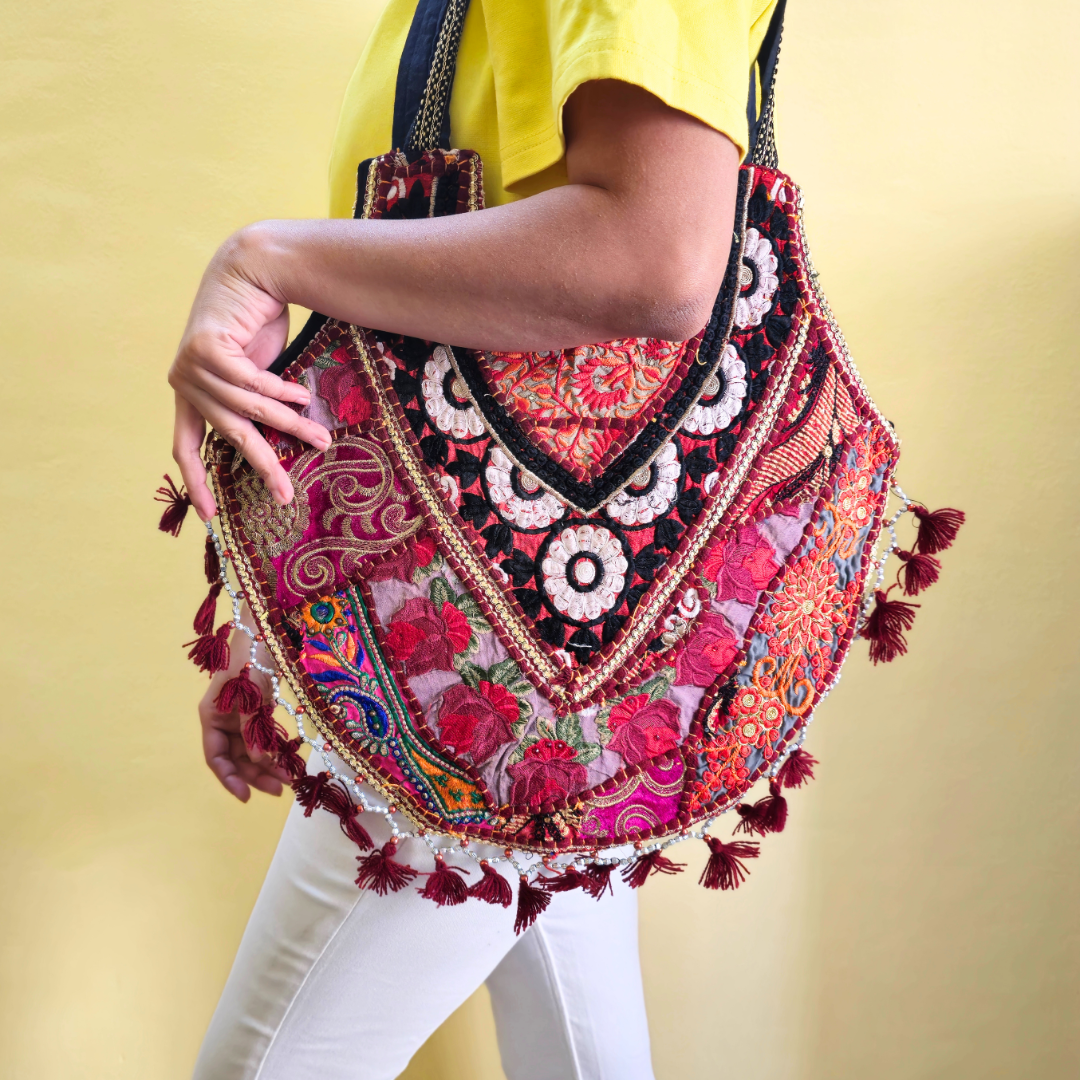 - The tote displays a richly embroidered surface with layered patterns, contrasting colors, and ornamental fabric panels.