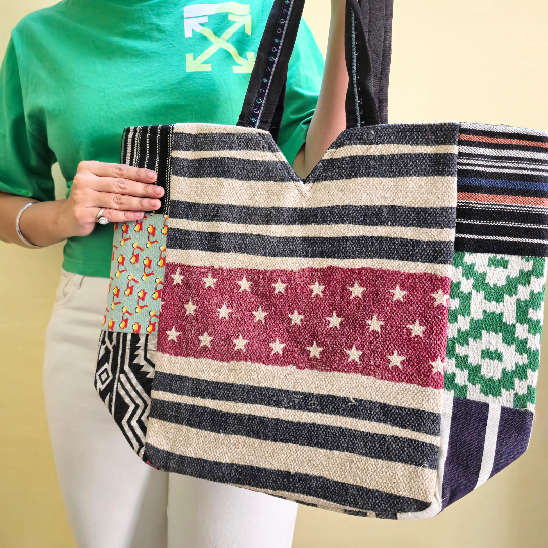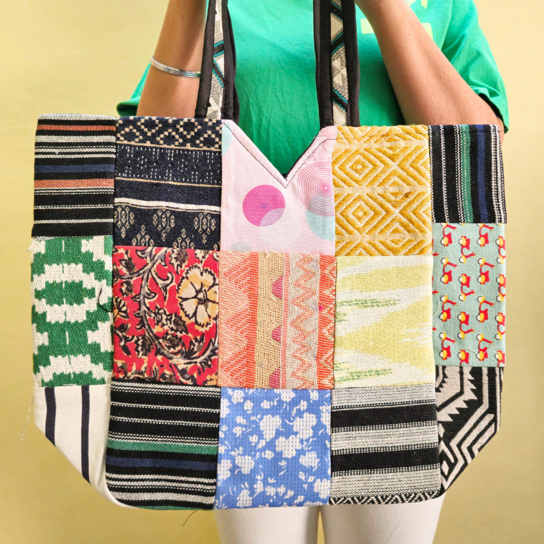 • The tote features a patchwork construction made from multiple fabric panels with varied colors, prints, and woven textures.