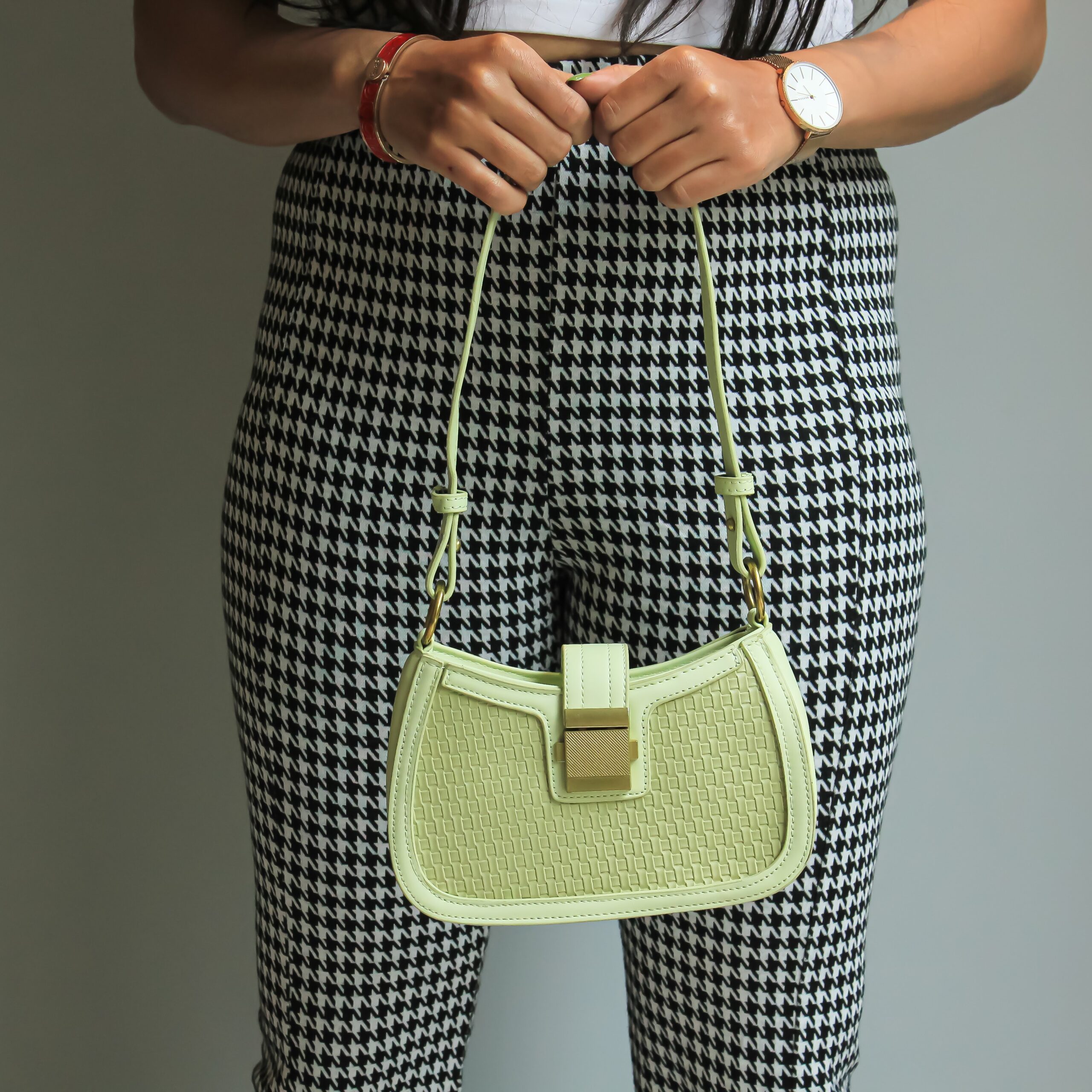 - Features a compact, structured silhouette with a modern geometric pattern that enhances its chic, contemporary look