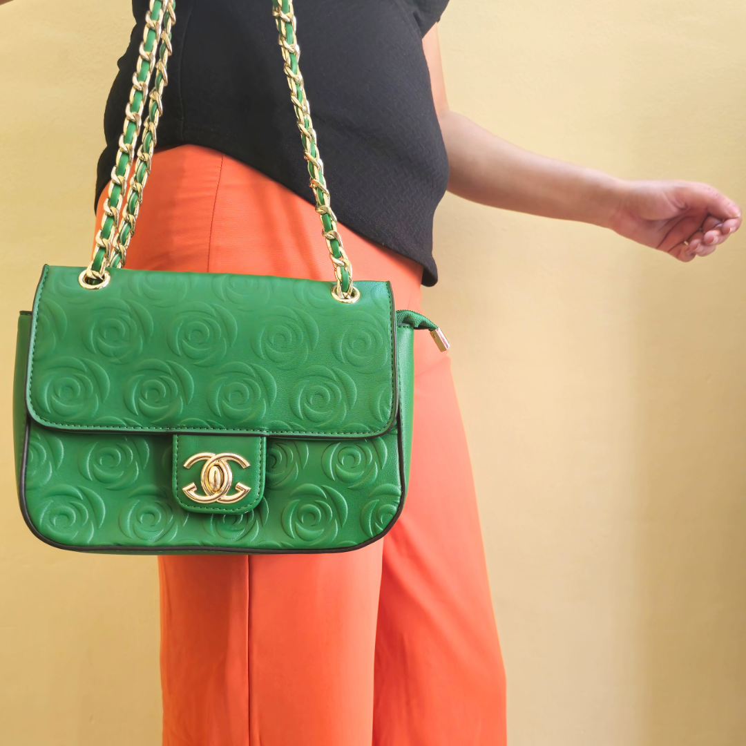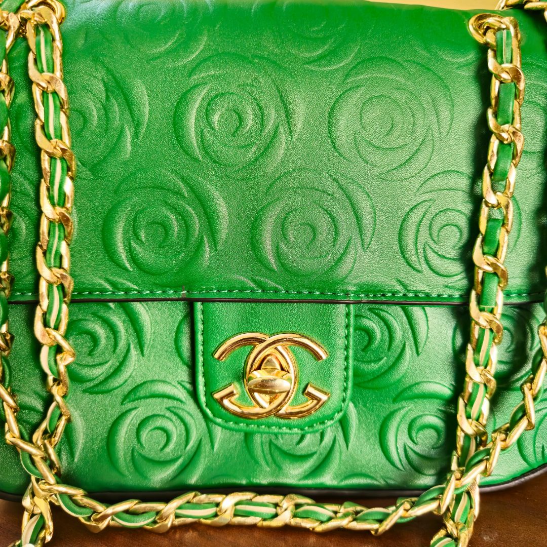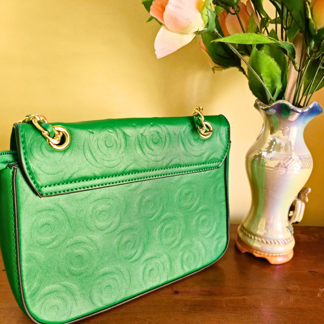 - Green surface displays embossed rosette swirl patterns across the front flap